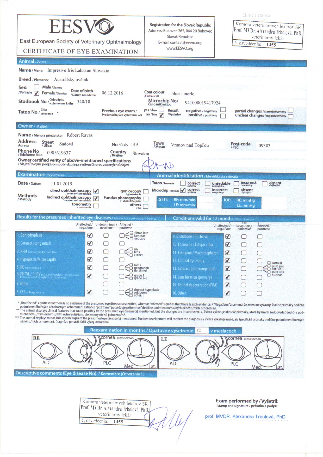 DNA tests: CEA,PRA,HSF4,MDR1,DM,CMR1,HUU,MH,NCL6,vWD clear